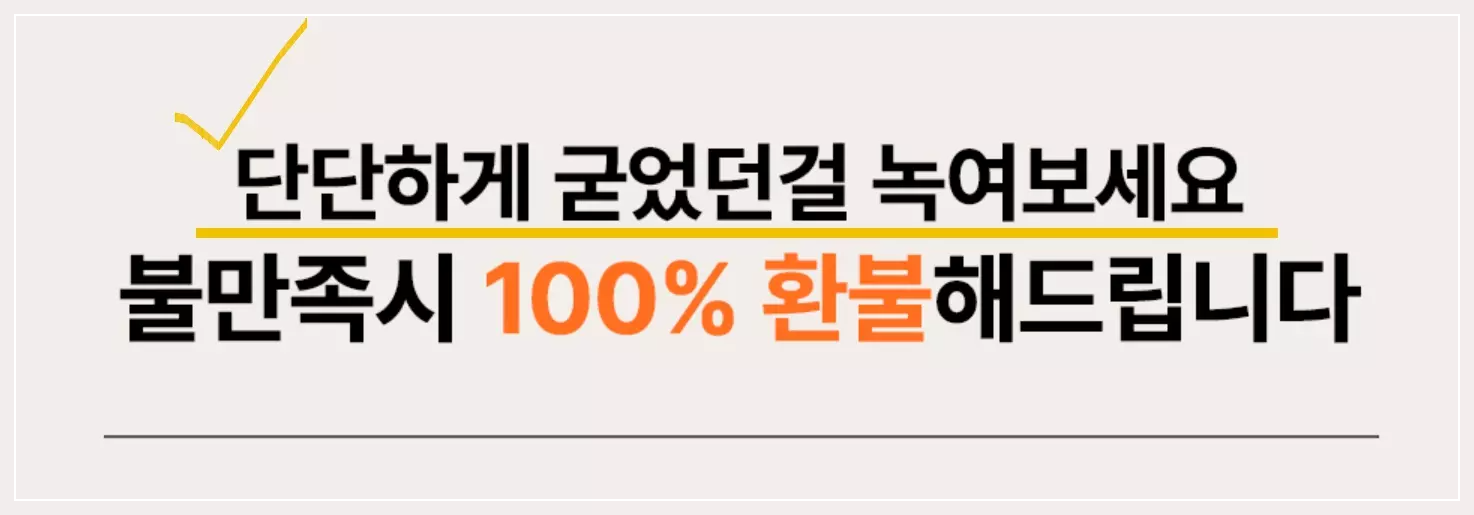 뮤디트 브로멜라인에서는 "단단하게 굳었던 걸 녹여보세요. 불만족시 100% 환불해 드립니다." 라는 말을 합니다. 물론 뮤디트 브로멜라인이 의약품이나 건강기능식품이 아니기 때문에 직접적인 효과 언급은 하지 못하지만 대부분 어떤 말을 하고 싶어하는지 눈치채셨을 것 입니다.