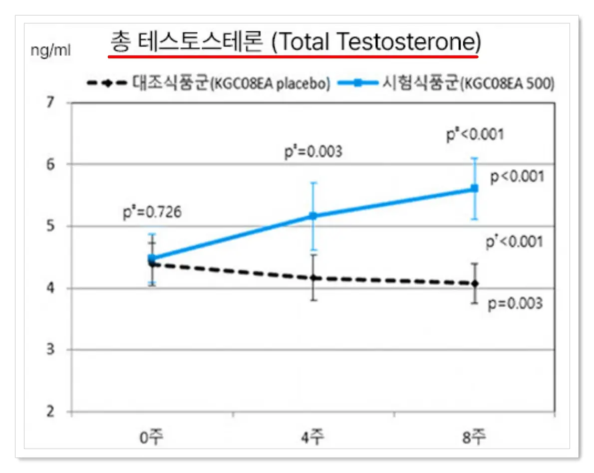 특히 4주부터 대조군에 비해 유의미한 효과가 나타나는 것을 알 수 있었으며, 8주 이상 섭취시 테스토스테론 수치가 점진적으로 늘어나는 것을 알 수 있습니다.