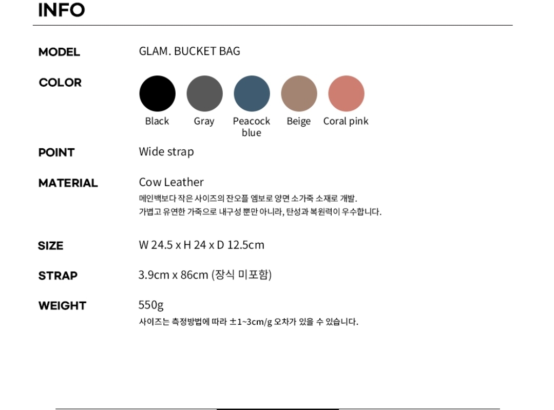 색상은 5가지가 있으며 주문시 버킷백 색상만 고르면됩니다 저는 사진에서 보다시피 베이지를 시켰는데요 (처음에 블랙이 잘못 배송와서 교환해야하는 번거로움이 있었습니다 . ) 베이지라기엔 약간 핑크빛이 도는 톤다운된 베이지랄까 제가 기대한 베이지색은 아니었어요 그레이,블랙,베이지가 무난해서인지 금방 매진되더라구요.