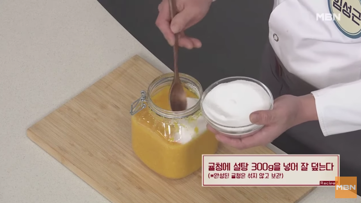 - #7. 귤청에 설탕 300g을 넣어 잘 덮습니다. (완성된 귤청은 섞지 않고 보관)