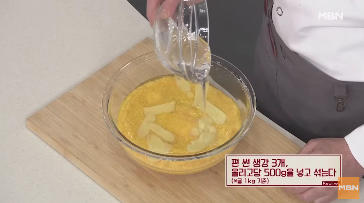 - #5. 편 썬 생각 3개, 올리고당 500g을 넣고 섞어 줍니다.
