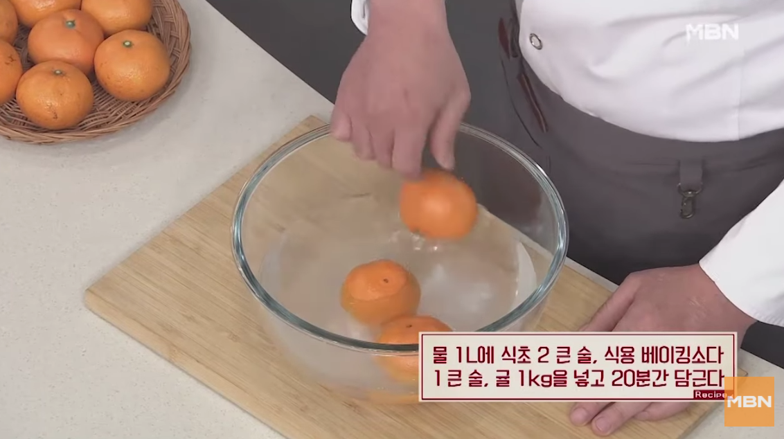 - #1. 물 1L에 식초 2큰술, 식용 베이킹소다 1큰술, 귤 1kg을 넣고 20분간 담가 놓습니다.
